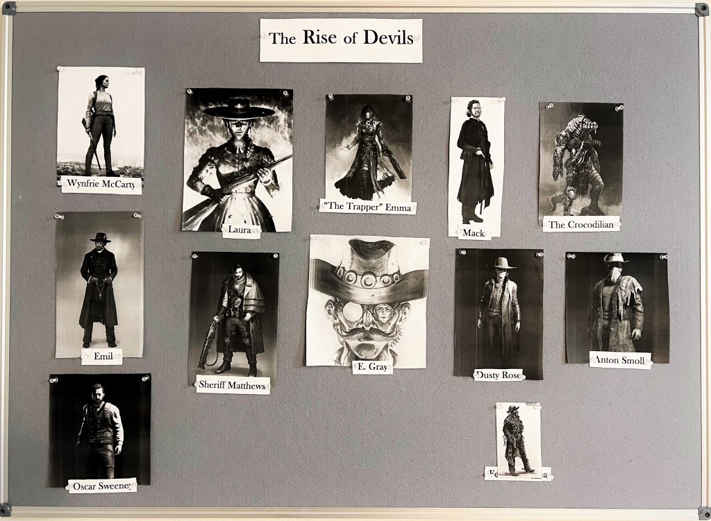 This project board belongs to The Rise of Devils (obviously) and it was done in just a couple hours. Though this is a rudimentary beginning to the story board, you are always free to switch out characters and add more to the empty spaces. Actually, you are encouraged to do so. Building your world on a story board makes it easier for a writer to build their world on paper.